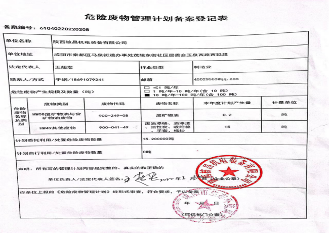 我公司屬機電一體化、機械加工等產(chǎn)業(yè)的生產(chǎn)及經(jīng)營活動, 現(xiàn)階段主要的危險廢物包括:油漆桶、廢機油、乳化液、噴漆、噴砂。油漆桶、廢機油、乳化液等危險廢物處置由陜西明瑞資源再生有限公司承接轉(zhuǎn)運及處理危廢;噴漆、噴砂房等由公司投入大量資金進行升級改造,在經(jīng)營活動中加強職工環(huán)保培訓(xùn),不斷提升職工環(huán)保意識。經(jīng)陜西格林秦灃環(huán)??萍?/span>有限公司監(jiān)測,所排廢氣均達到國家標準。為改善環(huán)境、大氣質(zhì)量作出積極的貢獻。